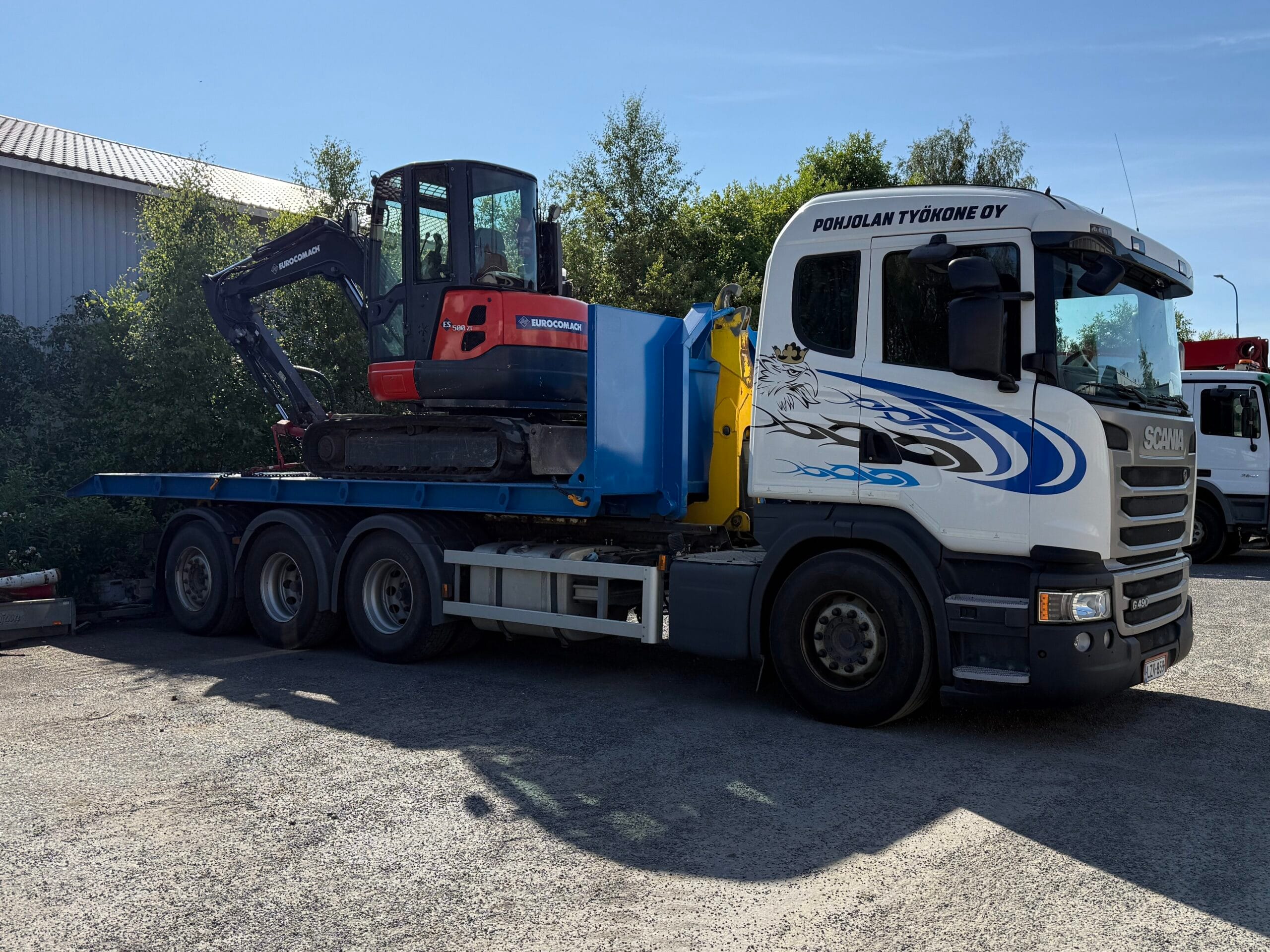 Kauttamme hoituu myös vaihtolavapalvelut, koneiden siirrot, maanajo ja kaivinkonetyöt kumitelakoneilla.