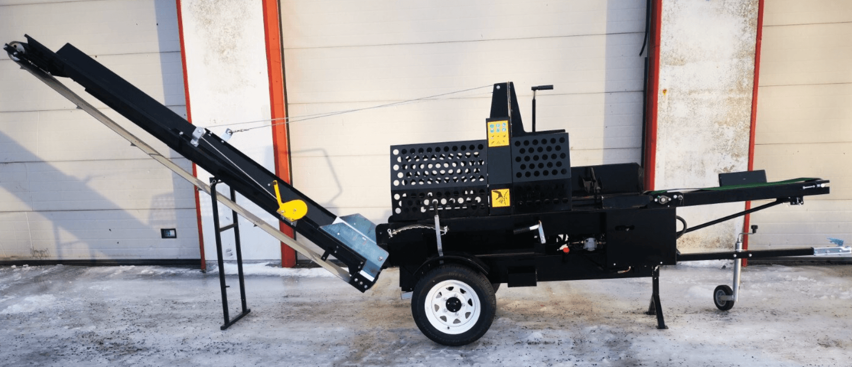 Kone on varustettu hydraulisella syöttökuljettimella. Nostat vaan puun kuljettimelle ja ajat kuljettimella halkaistavan puun oikeaan kohtaan. Kuljetin ei pyöri koko ajan vaan kuljetinta ajetaan erillisestä sauvasta.